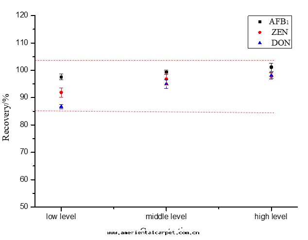 AFB1、ZEN、DON在(zài)高(gāo)中(zhōng)低(dī)3个(gè)浓度(dù)下(xià)回(huí)收(shōu)率