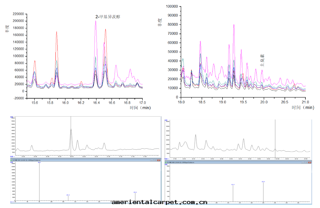 質(zhì)譜条件(jiàn):離子源(EI源),離子源温度(dù)230℃,接口(kǒu)温度(dù)280℃,掃描模式:選擇離子SIM模式,2-甲基异(yì)莰醇:定(dìng)量(liàng)離子95,定(dìng)性(xìng)離子95、107、135;土(tǔ)臭素:定(dìng)量(liàng)離子112,定(dìng)性(xìng)離子112、125。