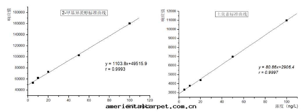 依據(jù)國(guó)标 GB/T32470-2016 生(shēng)活飲用(yòng)水(shuǐ)臭味物(wù)質(zhì) 土(tǔ)臭素和(hé)2- 甲基异(yì)莰醇檢验(yàn)方法(fǎ),采用(yòng)美(měi)正(zhèng)全(quán)自動(dòng)固相微萃取(qǔ)系統處(chù)理(lǐ)進(jìn)樣(yàng),取(qǔ)100µl的(de)标準母液,用(yòng)甲醇做稀釋溶劑,定(dìng)容至(zhì)10.00ml,混勻;再取(qǔ)100µl的(de)中(zhōng)間(jiān)液,用(yòng)甲醇做稀釋溶劑,定(dìng)容至(zhì)10.00ml,此(cǐ)为(wèi)應(yìng)用(yòng)液,濃度(dù)为(wèi)10ng/ml。分(fēn)别取(qǔ)5个(gè)20ml顶空(kōng)瓶(píng)內(nèi),加入(rù)優級純NaCl3.0g,和(hé)5ml純水(shuǐ),溶解(jiě)後(hòu)加入(rù)5µl、10µl、20µl、50µl、100µl應(yìng)用(yòng)液,最後(hòu)定(dìng)容至(zhì)10.00ml,此(cǐ)系列的(de)濃度(dù)分(fēn)别为(wèi)5ng/L、10 ng/L、20 ng/L、50 ng/L、100 ng/L,混勻後(hòu)固相微萃取(qǔ)進(jìn)樣(yàng)测試。