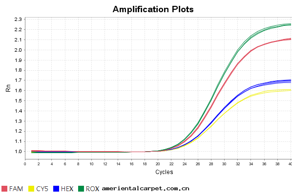 利用(yòng)探針(zhēn)法(fǎ)擴增從2.5ng/μl的(de)質(zhì)粒(lì)DNA模闆至(zhì)5倍梯(tī)度(dù)稀釋0.12fg/μl, 图(tú)中(zhōng)顯示的(de)是(shì)每个(gè)稀釋梯(tī)度(dù)重(zhòng)複4次(cì)的(de)結果,顯示Qgen960 Plus具有(yǒu)宽(kuān)廣的(de)動(dòng)力學(xué)範圍。